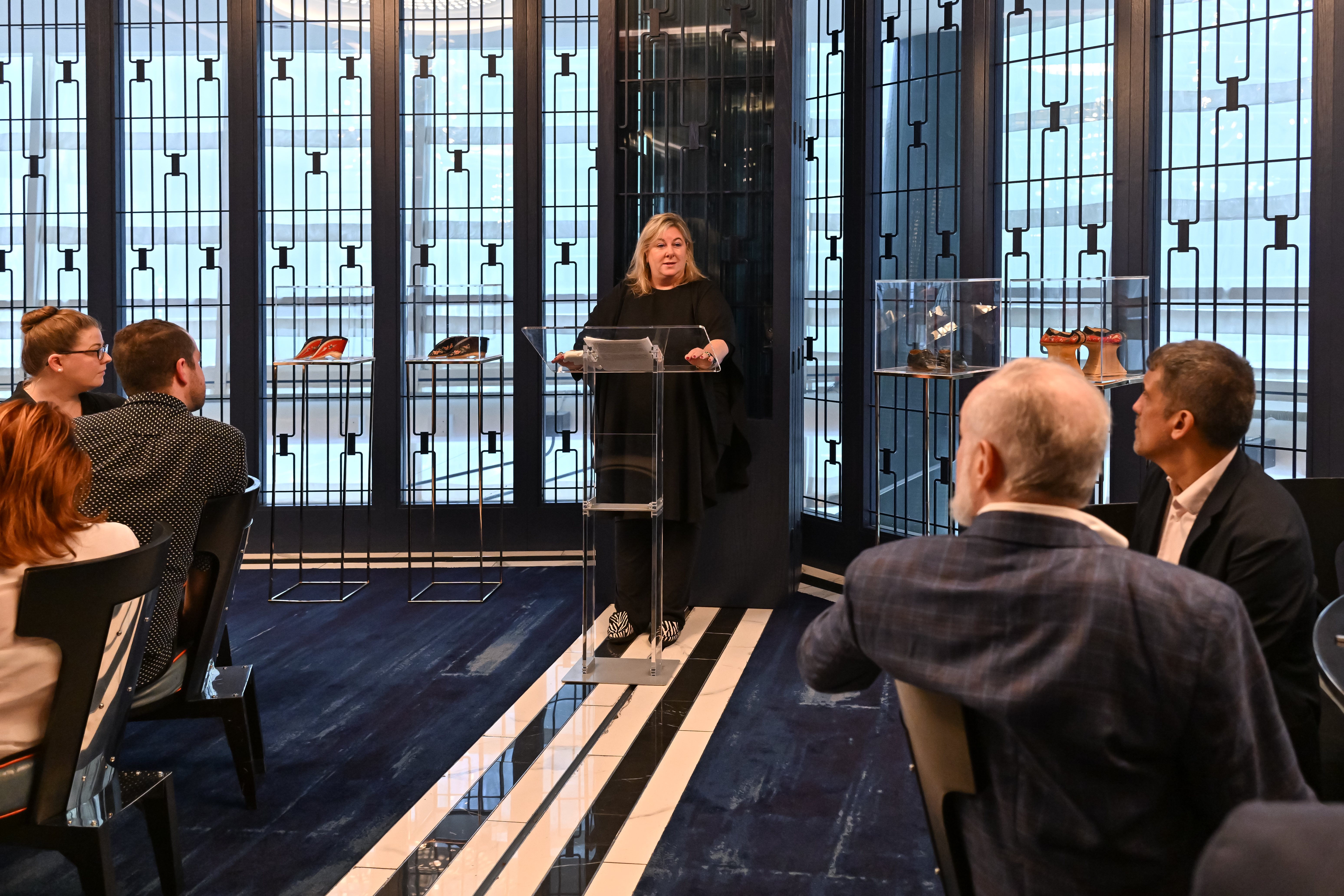 The Noel Shoe Museum welcomed its Stiletto Ambassadors for a delicious luncheon in the private dining room at Hutong. Over lunch, Dr. Luca Lo Sicco, the museum’s Director of Education, led a fascinating conversation on lotus shoes, foot binding, and women’s culture from the Song Dynasty (10th century) through the Qing Dynasty (20th century). Guests also enjoyed a curated selection of exquisite lotus shoes from the museum’s permanent collection.